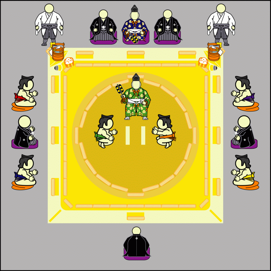 These items are given by the previous bout competitor to the current bout’s fighters. If we assume there are four wrestlers, A & C are from the east side and B & D are from the west side then the ritual goes as such: if wrestlers A & B fight, and A wins, A sticks around and hands the power water and paper to wrestler C for the C’s bout against wrestler D. In effect, wrestler A is giving wrestler C his power to help them in their match. If a wrestler loses their match, they’re not allowed to hand these items over, only the victorious wrestler may do so.
