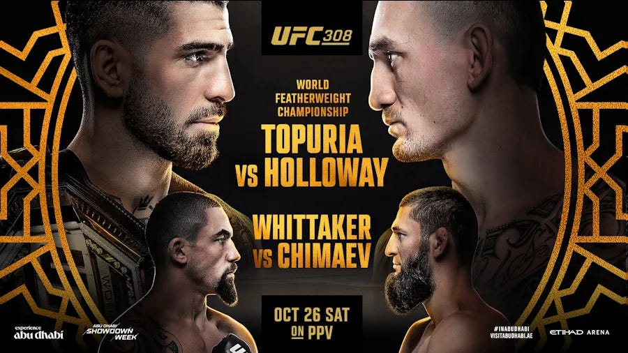 I cannot stop thinking about the disparity between the top two fights on this card. Ilia Topuria vs Max Holloway is pivot-point-of-the-future material, a battle between one of the greatest to ever do it and one of the biggest phenoms in the sport, a war to be the absolute, undeniable best in the world! Robert Whittaker vs Khamzat Chimaev is the UFC's third or fifth or seventh attempt to get a guy to the belt despite having never fought a ranked Middleweight in his life.
