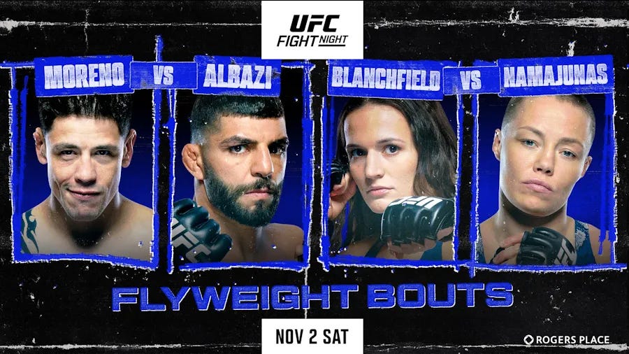 But the other side of that story is, uh, everything else. Albazi is 5-0 in the UFC, but it took him almost six years to get there because he just cannot stay active. In the time it took him to accrue those five fights, he's had seven cancellations. Not all of which were his fault! But they also meant a lot of his relevant matchups--Tim Elliott, Alex Perez, Royval, Moreno himself--were left scratched, and in their place, he fought folks who don't exactly justify contendership. Three of those five opponents aren't in the UFC anymore, two retired altogether, and the fourth was Alessandro Costa, who was a last-minute, short-notice Contender-Series-veteran promotional debut.