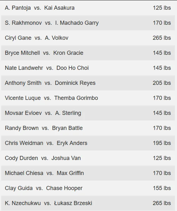 Yeah, I don't know. I don't know, man. Kron Gracie's here. He hasn't won a fight since February of 2019, he got beat silly by Cub Swanson in October of that year and took almost four years off from the sport, he showed up again in May of 2023 and looked so absurdly bad against Charles Jourdain that Dana White talked openly about if Kron should be competing anymore, and that was it. That was it! One fight in more than five years and he lost so badly that he had to blame having too much respect for Brazilian Jiu-Jitsu to do things like 'not get punched' or 'punch back.' And from that, here, today, he is fighting for a top fifteen berth in the rankings. Sean Woodson, who is undefeated at Featherweight and on a three-fight winning streak that includes Charles Jourdain, is fighting an unranked man on the prelims of next week's televised fight night. Kron Gracie, who hasn't won a fight since the cancellation of The Big Bang Theory and whose last crack at the apple went so poorly that the post-fight presser was largely about management's confusion about what he was doing in the sport at all, is on the main card of this pay-per-view fighting for a number by his name.