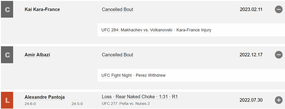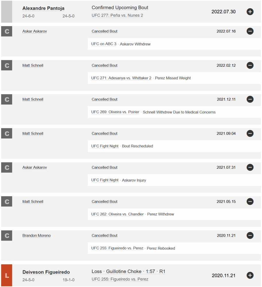 It's an amazing matchup! I'd love to see it! It's not gonna happen. Let me present to you the Tapology listing for the last two years in the career of Alex Perez: