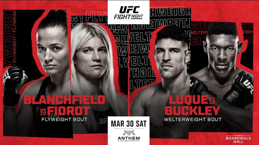 This card's main event was Vicente Luque vs Sean Brady. Two periphery-of-the-top-ten Welterweights on one-fight winning streaks were going to main event this card over Erin Blanchfield and Manon Fiorot. We're only here because Brady got hurt. Blanchfield and Fiorot didn't even get their own fucking poster.