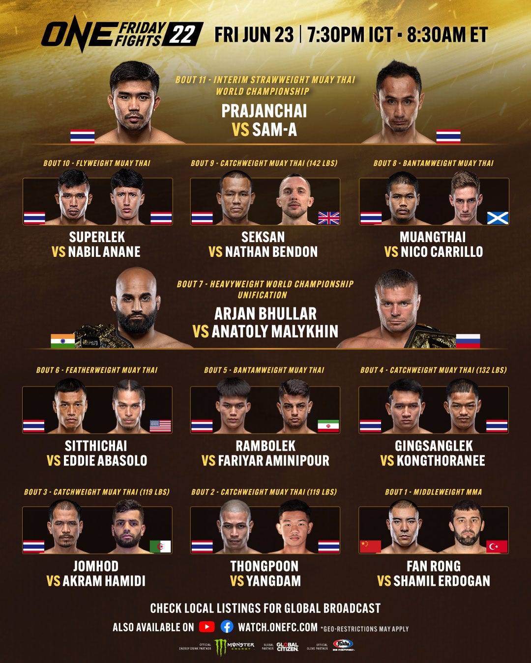 Prajanchai was last seen in the co-main event of ONE Friday Fights 1 and has an incredible 339-52 record at age 27. He also has a majority decision title win two years ago against his opponent tonight, Sam-A. Sam-A appeared on the last big OFF show, knocking out Ryan Sheehan. His record is an even more incredible 373-48, though he is 39 years old. Quite a title fight when both of your fighters have about 400 fights. In fact, Sam-A was the first champion in this division, he lost the title to Prajanchai, who then lost it to Joseph Lasiri. There is some sort of political posturing going on in ONE, and it has lead to this fight being a 5-rounder that is creating an interim title.