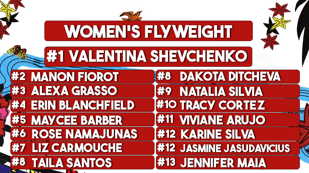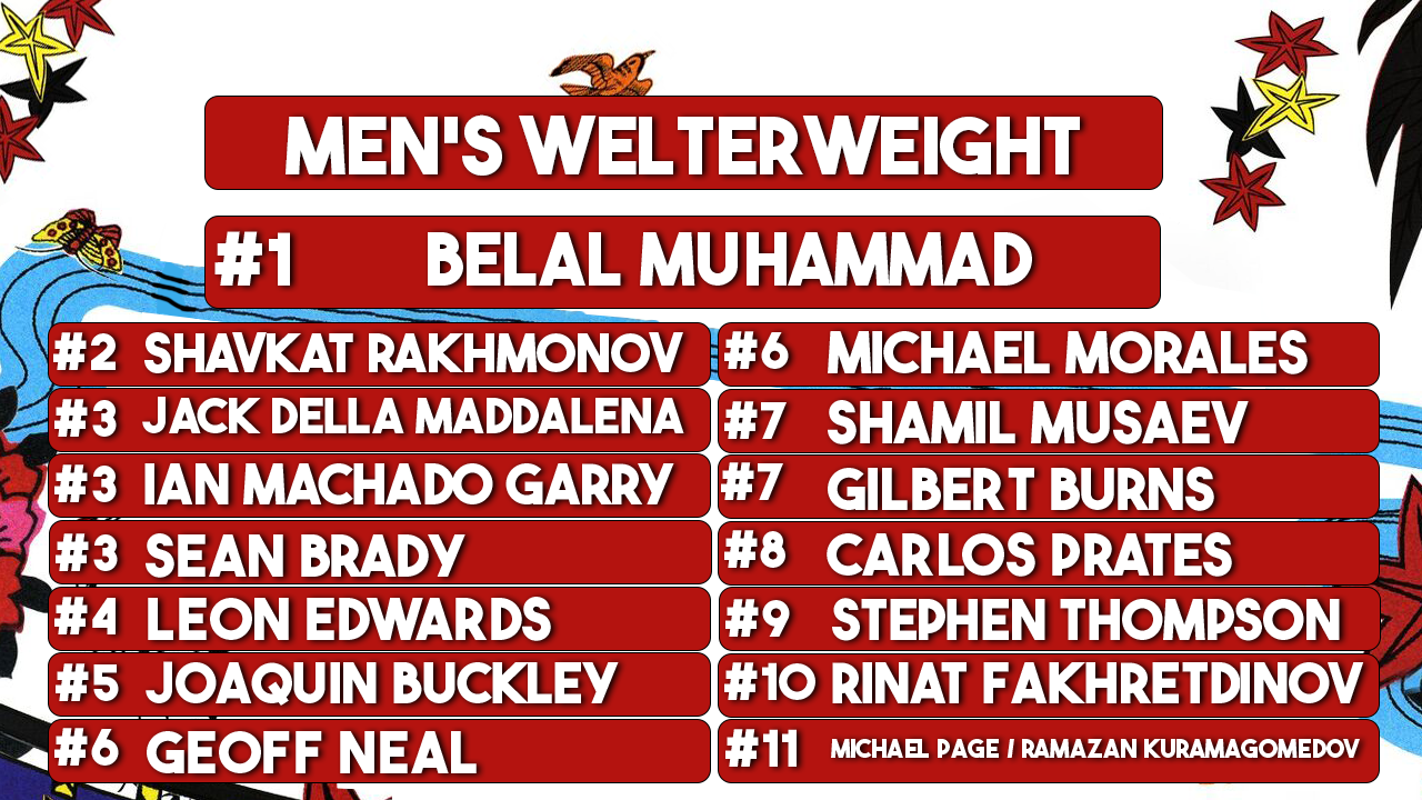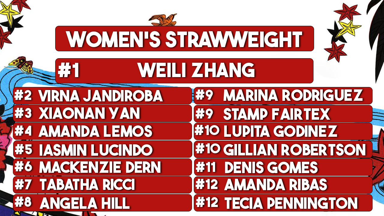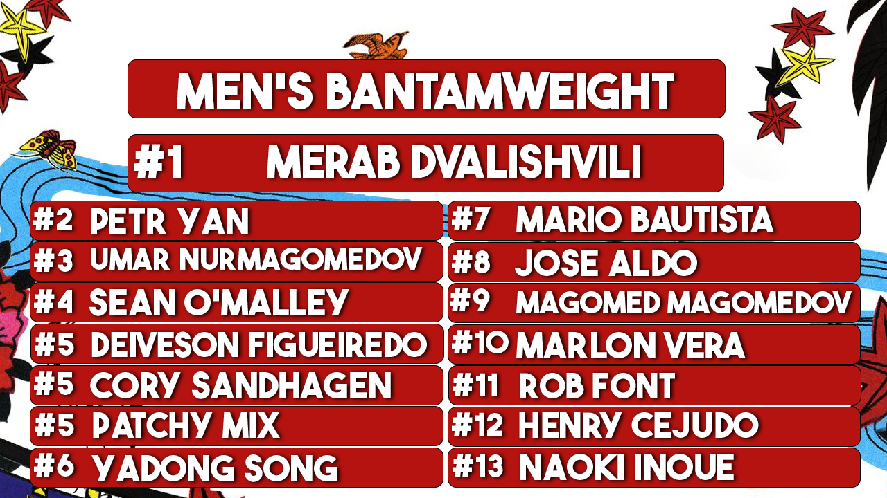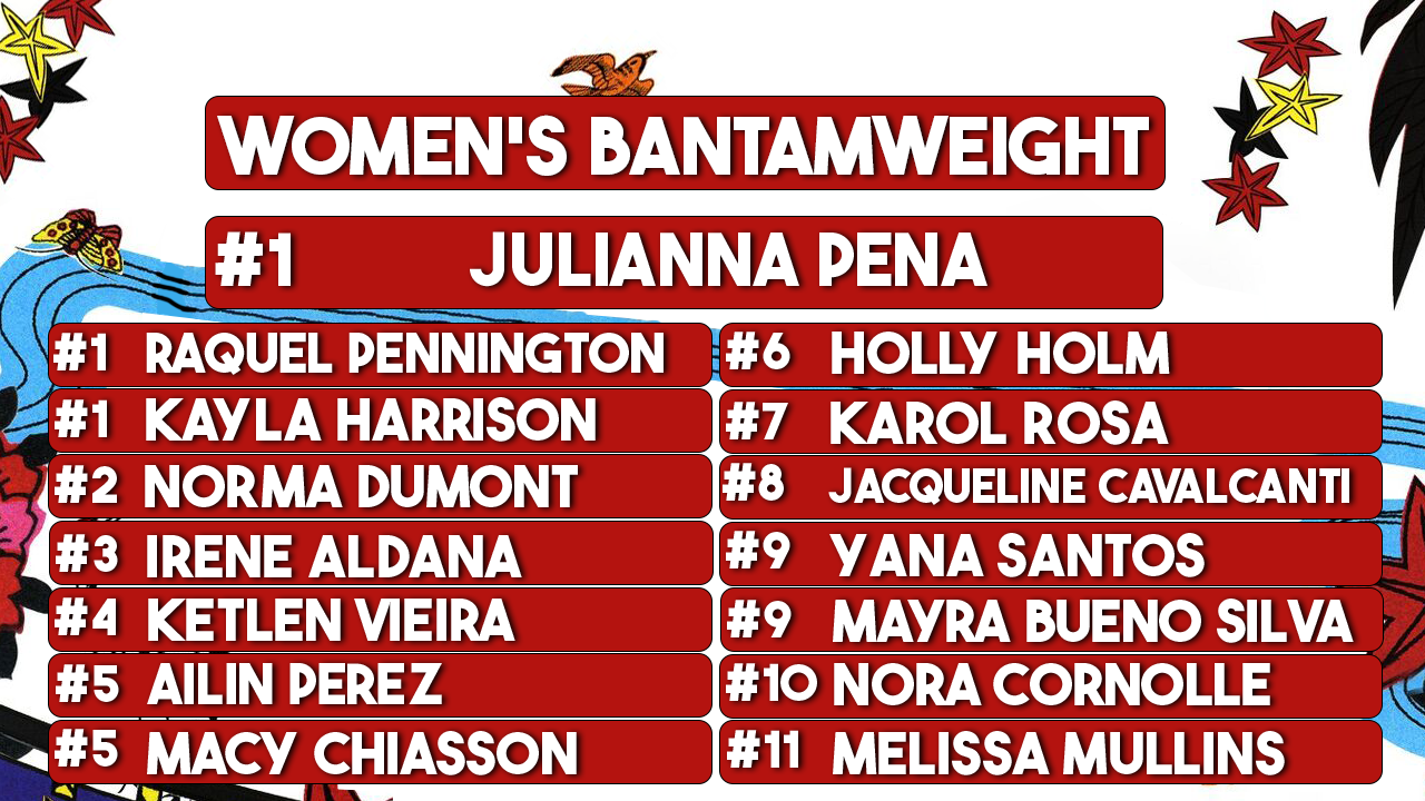 Eric: I think is worth noting is that there are ties across almost all divisions in our rankings. I think, at least in concept, this is a good sign that there is disagreement in how and who we rank. It also signals to me that this sport has more need for ties for rankings. Like…I don’t think anyone would disagree with the Top 3 people in Women’s Bantamweight being the same three we ranked at #1, with Pena in the top spot solely for being the belt holder. Additionally, for those curious, we use a points system for rankings which is why this sort of thing can happen. Same with the amount of ties in Lightweight, which we all accept and agree is, ultimately, the most stacked division across all of MMA.