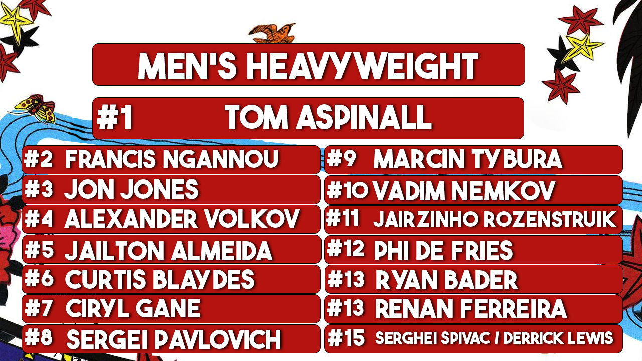Carl: Oddly, for as much as I was just complaining about the aforementioned anti-rankings matchmaking, the ties are a big indicator of the subjective weeds you can get into. Women’s Bantamweight is a great example: I, personally, ranked Pennington above Pena despite Pena winning the belt from her, because I think the decision was an incredible robbery. But the UFC title is the de facto standard for determining the top fighter in the sport, so Eric’s point about Pena being #1 is entirely sensible. But how much of that comes down to the undeniable observation of the UFC’s monopoly on mixed martial arts and how much comes down to their own choices eroding that right? The UFC ranks Jon Jones above Tom Aspinall because his belt is The Real Belt, but we have Aspinall at #1 because he has actually fought and defeated a bunch of Heavyweights. We’re at an incredibly weird moment for ranking the sport, because historically, rankings disputes have come down to challenges from other organizations, but with Bellator dead, the PFL still figuring out how their own championships work and ONE trying to push their MMA divisions into a shallow grave, for the first time, we have disputes coming from the UFC screwing up their own rankings.