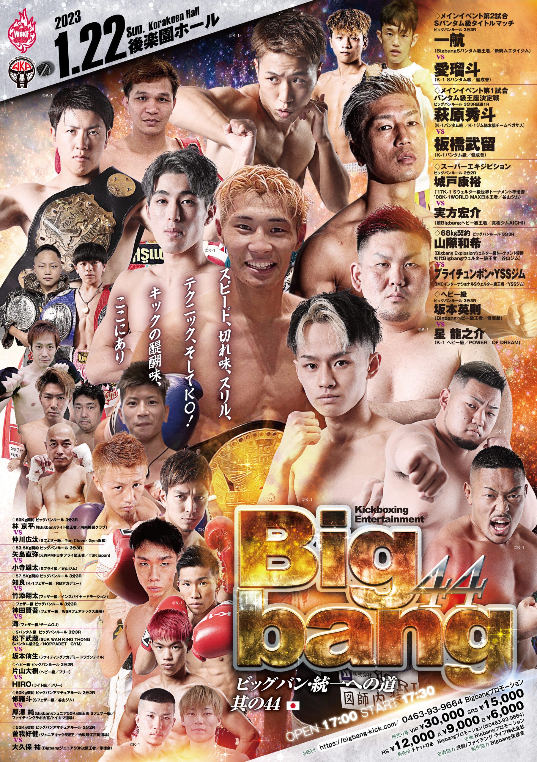 The main event is 21-year-old Super Bantam champion Ikko Ota attempting the first defense of his title after winning it over Momotaro Kiyama at Bigbang 43 in September. His challenger is 20-year-old Eruto, who left K-1 after two straight losses to win a decision over Ranmaru at Super Bigbang in November and earn this title shot.