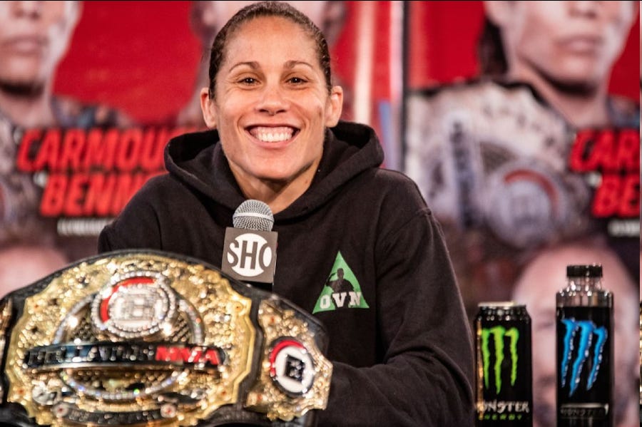 It took more than a decade and some controversy, but Liz Carmouche got her flowers. "Girl-Rilla" was just as present a figure in establishing women's MMA in the mainstream, but she's the most consistently forgotten because she was the losing fighter in all of those establishing moments. She was a challenger for the early, pre-fame Strikeforce Women's Bantamweight Championship, and was winning on the scorecards before Marloes Coenen choked her out. She was a central part of the inaugural Invicta FC card, and was planned as a title contender before the big show came calling. She became one half of the first women's fight in UFC history, and at one point had Ronda Rousey in a nearly destiny-defying neck crank, but was ultimately submitted in the first round. She's one of two women to ever defeat Valentina Shevchenko, but when given a second chance at the now-UFC champion Shevchenko, she fell short. Despite her powerful wrestling and submission skills, she was eternally denied the top of the mountain. So it was both particularly appropriate and particularly cruel when she finally won a championship on April 22, 2022--in a way that displeased everybody. Standing champion Juliana Velasquez was winning on every scorecard, but Liz Carmouche got her in the crucifix position and landed a number of, respectfully, small elbows, but referee Mike Beltran called a TKO to the immediate chagrin of the entirely safe ex-champion. The controversy made a rematch all but mandatory, and it took Bellator most of the year to do it, but the two met in the cage to run it back at Bellator 289 on December 9, and this time there was no controversy, as Velasquez submitted to an armbar two rounds in. The weirdness didn't stop there: Liz's next title defense against Deanna Bennett also hit the skids, as Bennett missed weight and was thus ineligible to win the championship. Carmouche put it on the line anyway, and fortunately, she choked Bennett out in the fourth round. She defended her title against Ilima-Lei Macfarlane at Bellator 300 on October 7th, and it was one of those fights where friends don't really want to hurt each other--until Ilima got kicked enough that her leg collapsed in the fifth round. Her status as champion is questionable, though--of all Bellator's titleholders, Liz is the only one taking part in this year's PFL season. She'll kick it off by rematching Juliana at PFL 1 on April 4. What that means for her title reign, I have no idea.