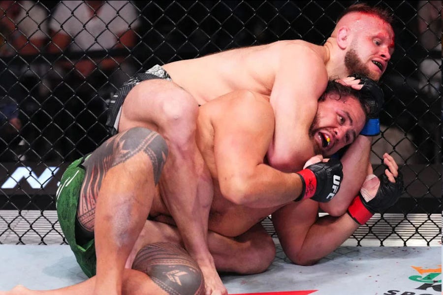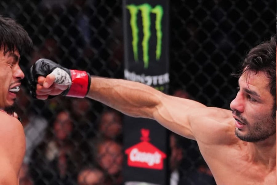 Sometimes, you just have someone's number. Brandon Moreno spent years fighting through a quadrilogy with Deiveson Figueiredo, and unfortunately for him, he had another trilogy waiting for him the second it was over. Alexandre "The Cannibal" Pantoja was Moreno's personal bogeyman, a man who'd fought and beaten him twice. But one of those fights was an exhibition on The Ultimate Fighter, and the other was against a Moreno with five less years of evolution and growth. Surely, a third fight in 2023 would be different. And it was--unlike the previous, one-sided dominations it was a fight-of-the-year candidate that took both men to their limit and led to a split decision--but its ending was not. Alexander Pantoja scored a third victory over Moreno, and with it, after sixteen years of competition, he finally became the clear, unequivocal best in the god damned world. Which was made even more poignant when he used his post-fight interview to ask if his absentee father was proud of him--and was made even more irritating when he also revealed that despite having eleven fights in the UFC at the time, he was paid so little that he'd been part-timing as a Doordash driver just to make ends meet right up until 2022. The idea that one of the absolute best fighters on the planet, after years and nearly a dozen fights in the world's biggest, most profitable fighting organization, would need to take on a gig-economy job to make money is outright offensive, and in a better world, it would have launched a furor. In this one, all we can do is be happy he's got the belt and will, hopefully, make some actual fucking money. His first title defense came against Brandon "Raw Dawg" Royval as the co-main event to UFC 296 on December 16th, and it was a wild affair with a couple scary moments, but Pantoja emerged victorious and notched the first successful defense of the title in three years. His next contender is, in all likelihood, the winner of the Brandon Moreno/Amir Albazi fight this February--or it would have been, until Albazi got injured. The UFC promoted a Moreno/Royval 2 showdown in hopes of scoring a Moreno rematch, but Royval won, so the UFC decided to forget the whole goddamn thing and book Pantoja against the #10-ranked Steve Erceg on May 4. Sure. Whatever.