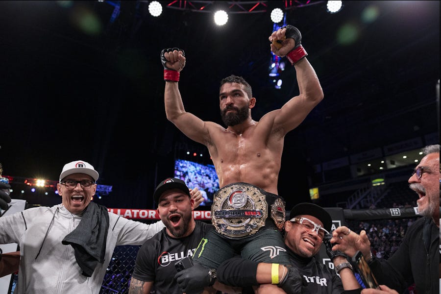 It took a long goddamn time, but Patchy Mix is finally getting the credit he deserves. Fans had already singled out Patchy as a uniquely talented fighter by 2019, when he signed to Bellator as the 10-0 King of the Cage Bantamweight Champion who'd submitted almost everyone he faced, but it wasn't really until he choked out Yuki Motoya at Bellator's first co-promotion with Rizin that people really paid attention. Which was unfortunate, because his next fight was a shot at Juan Archuleta for the vacant Bellator Bantamweight Championship and Archuleta schooled him on their feet, ending both Mix's title hopes and his undefeated streak. It didn't help matters when, two fights later, he blew his weight cut for a big Dublin match against James Gallagher. But Mix kept winning, and when he entered the Bantamweight Grand Prix and promptly stormed the bracket by beating Kyoji Horiguchi and choking out Magomed Magomedov, suddenly, people paid attention again. When he fought interim champion Raufeon Stots and knocked him out cold with a knee in less than a minute and a half, people began wondering if maybe he was the real champion and Sergio Pettis, who'd been out for a year and a half and returned to a vanity fight with Patrício Pitbull, wasn't the fake. The two met at Bellator 301 on November 17th, and Mix left no doubt: He outwrestled Pettis and choked him out in the second round. Patchy Mix is, finally, the undisputed Bellator Bantamweight Champion. He'll defend his title against Magomed Magomedov on May 17.