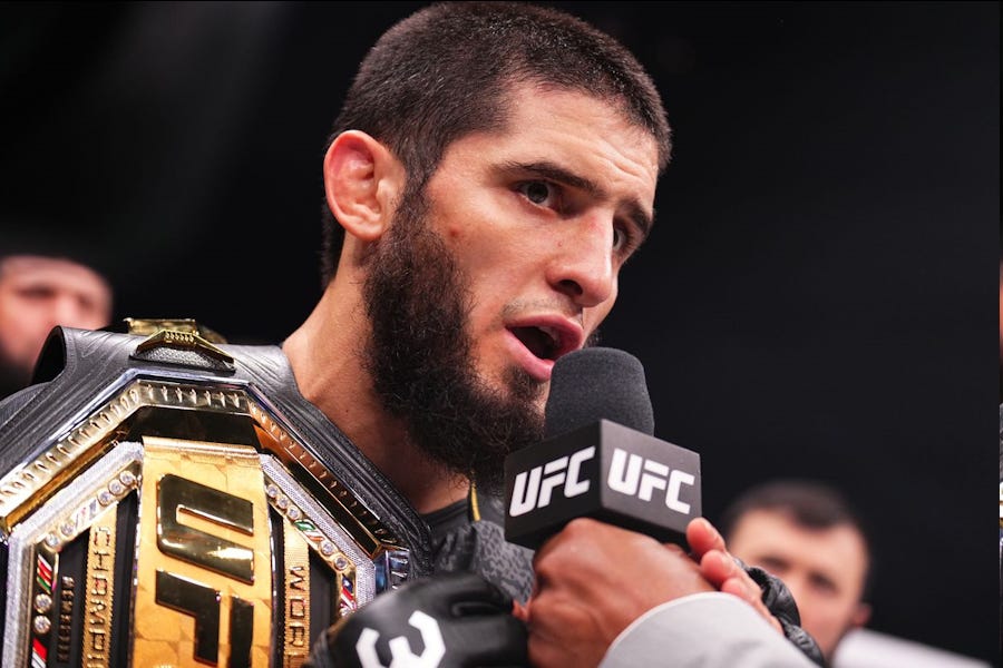 Destiny has come. When Islam Makhachev made his UFC debut in 2015, Khabib Nurmagomedov, considered by most to be the #1 contender and soon to be the best in the world, swore up and down that Makhachev, not him, would be the best lightweight champion of all time. Coming from him, the praise made sense: Khabib and Islam have trained together since they were children growing up and learning to wrestle in Makhachkala. Islam learned under Khabib's father, trained with Khabib's team and even made the pilgrimage to America to join Khabib at the American Kickboxing Academy. And then, two matches into his UFC tenure, Islam got knocked the fuck out in the first round by the little-known Adriano Martins, who hasn't won a fight in the six years since. Even as Makhachev racked up wins, the memory of his loss and his wrestling-heavy approach to his fights let people cast doubts on him. Sure, he's good--but he lost, so he's not as good as Khabib. Islam Makhachev, as his trainer tells it, never wanted to be Khabib. He loves fighting, but he doesn't love the spectacle or the glory or the attention. So when, after ten straight wins, Makhachev was picked to challenge Charles Oliveira for the vacant title he never truly lost, a lot of folks just weren't quite sure what to think. Sure, he was an incredible wrestler, but Charles Oliveira is a submission wizard, and sure, he's on a ten-fight streak, but he hasn't fought a single person actually IN the top ten, and Oliveira represents a huge, dangerous step up as a man who's been destroying some of the most accomplished lightweights in the sport's history. Analyst opinion was split right down the middle; the fight, as it turned out, was nowhere near that competitive, and the only analyst who was entirely correct was Khabib. Islam demolished the former champion, outstriking him, taking him down at will, controlling him in the grappling, and ultimately dropping him with punches and choking him out in the second round. His first defense was a different story. Islam faced featherweight champion Alexander Volkanovski at UFC 284 on February 12th in a rare best-of-the-best, champion vs champion match, and this time, his team's prediction of domination was thoroughly incorrect: It was a pitched battle that ended with Makhachev visibly exhausted and Volkanovski pounding on his face. Islam took an extremely close decision and the divisions will remain separate, but his aura of invulnerability has been thoroughly punctured. Or, at least, it was. In one of those funny moments of sport deterioration, his title defense against Charles Oliveira got scratched thanks to Oliveira busting his eyebrow in training, and on less than two weeks' notice the UFC ran Makhachev/Volkanovski 2, and with no hype, no marketing and no time to prepare, a visibly depleted Volkanovski got dropped by a headkick in the first round. Having now abruptly vanquished his rival, Islam Makhachev is...calling out the winner of the Leon Edwards vs Colby Covington welterweight title bout. God dammit.
