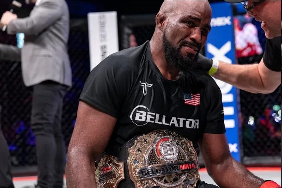 Ryan Bader is the greatest Bellator Heavyweight Champion of all time, and on a dairy farm somewhere in Wisconsin, Cole Konrad feels a pang of regret. Bader made his name as the winner of The Ultimate Fighter: Nogueira vs Mir all the way back in 2008, but his UFC career proved to be one of Sisyphean torment and humiliation that included, somehow, impossibly, being the only man to lose a UFC fight to Tito Ortiz during his last six years in the company. Bader left for free agency and Bellator in 2016 and became its light-heavyweight champion on his first night with the organization, and just two years later he became its first-ever simultaneous double-champion after knocking out the legendary Fedor Emelianenko and taking the heavyweight title. Bader would go on to lose his 205-pound crown, but Fedor never forgot his 35-second drubbing at the American wrestler's hands, and for his retirement fight, he demanded a rematch. Thus it was that the entire mixed martial arts community watched with bated breath as on February 4th, 2023, Fedor Emelianenko walked into the cage one last time and promptly got the absolute crap beaten out of him again. Ryan Bader remains undefeated at heavyweight. He was to defend his title against Linton Vassell at Bellator's series finale-sounding Bellator 300, but Vassell got injured and, as Bader himself put it in a reddit post, Viacom is done with Bellator and didn't want to pay for a replacement. Ryan Bader is the best heavyweight champion outside of the UFC, and it's anyone's guess if he'll still be champion of anything by January. He also, unfortunately, got his shit completely wrecked by Renan Ferreira in thirty seconds, making him the one and only Bellator fighter to lose at PFL vs Bellator.