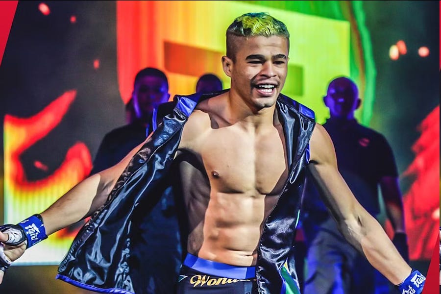 The second time was the charm. When Fabricio "Wonder Boy" Andrade joined ONE Championship back in 2020 he was a virtual unknown in the mixed martial arts world, a 20-3 kickboxer but only a 3-2 mixed martial artist who'd been fighting out in the regional circuit of China. His association with Tiger Muay Thai put him on ONE's radar, and his visible striking skills despite being just 21 at the time made him interesting enough for a developmental contract. Said contract proceeded to develop into Andrade going on a five-fight winning streak that only got more dominant as he met tougher competition, and three straight first-round knockouts punched his ticket to the championship picture. His first appearance in the spotlight, unfortunately, went a touch awry. First, bantamweight champion John Lineker lost his title on the scale after missing weight, meaning only Andrade was eligible to become champion, and he was well on his way to doing so before hitting Lineker with an errant strike to the groin so hard it shattered his cup, and with the fight not yet halfway complete, it had to be rendered a No Contest. It took four months to get to the rematch, and it was much more closely contested, but after four rounds Lineker threw in the towel, his face having been punched too swollen to continue. Fabricio Andrade is 25 and a world goddamn champion. He promptly skipped away from MMA completely and faced Jonathan Haggerty for ONE's Featherweight Kickboxing Championship on November 3rd, where he was immediately destroyed. Haggerty wants an MMA fight next.