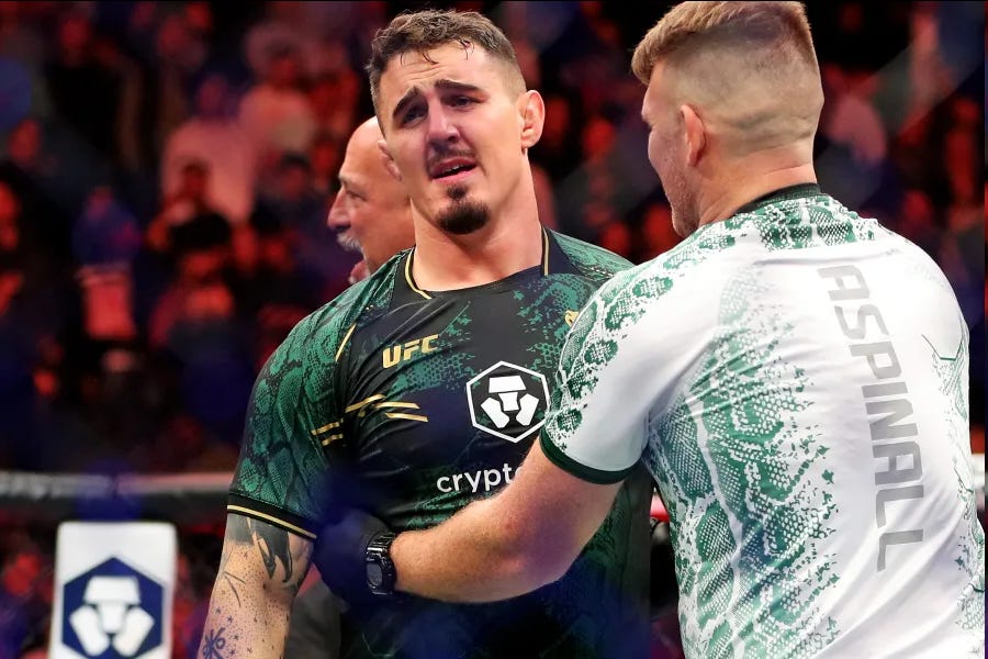 The UFC's Heavyweight division got itself into a weird spot in 2007. Randy Couture was the rightful, reigning, defending champion, but he and the UFC had a dispute that stretched out more than a year. The UFC couldn't strip him--it would have made it easier for him to get out of his contract--so they made an interim title. By the time Randy came back they had already made big plans for him and Brock Lesnar, but the interim title had gotten wrapped up in The Ultimate Fighter 8 (jesus christ) and it, too, had to be defended, meaning there were two championships being defended simultaneously: The Undisputed Championship, which was the 'real' belt despite being held by a guy trying to leave the company and contended for by someone with only two victories in the sport, and the Interim Championship, which was being fought over by the actual, legitimate top contenders. At UFC 295 on November 11th, 2023, Tom Aspinall, the rightful #4 contender, fought Sergei Pavlovich, the rightful #2 contender, for a new interim championship. And he won. On two weeks' notice! Aspinall's been one of the most promising heavyweight prospects in the world for years, his only loss in the UFC came from his knee tearing itself apart fifteen seconds into a fight, and he went toe-to-toe with one of the scariest punchers in the history of the sport and knocked him flat in just barely over a minute. He is, indisputably, the real deal. And now he gets to be the interim champion of a Heavyweight division in which the real champion, Jon Jones, is going to be out injured well into next year and, the UFC has made clear, will be returning to defend his title against Stipe Miocic, who by that time will have been on the shelf for 3+ years and will be going on 42. So congratulations, Tom. You're the real Heavyweight champion. I hope you get some credit for it.