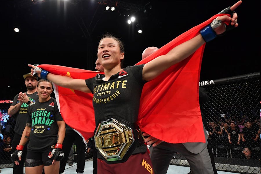 Are you really surprised? There's a long tradition of underestimating unlikely champions in mixed martial arts, particularly when they're not the fan-friendliest in style or personality, from Michael Bisping to Frankie Edgar, only to have those demeaned champions remind the world that they didn't reach the peak of their divisions by mistake. Many of the wise, studied scribes of the sport warned the foolish masses against assuming the same about Women's Strawweight Champion Carla Esparza: She was no pushover, they said, and Zhang will have real trouble. And then, come fight day, we unwashed masses pulled them from their ivory towers and forced them to run in the streets amongst the mud and filth so they, too, could feel the unburdened joy of being, because Zhang Weili, as basically every fan had assumed, did, in fact, beat the absolute tar out of Carla. It wasn't particularly close: Carla got outlanded 37-6, hurt several times on the feet, and choked out just a minute into the second round. The inexplicable, season-long Cookie Monster subplot is over, Zhang Weili is now a two-time world champion, and things are back as they should be. What comes next, however, is tricky. Carla was blown out, so a rematch is out of the question. Rose Namajunas, the only person in the UFC to beat Weili, is a likely candidate--but after her disastrous performance against Carla, it remains to be seen how much faith the UFC has in her. Jéssica Andrade has a claim, but she's splitting time between 115 and 125, and probably needs to pick a weight class if she wants a shot. So the UFC solved the problem by picking Amanda Lemos. In a surprise to no one, Zhang absolutely dominated Lemos, outstriking her 296-29, smashing her to the tune of multiple 10-8 rounds, and winning a very, very wide decision. The next step is a China vs China championship showdown against Yan Xiaonan at UFC 300.