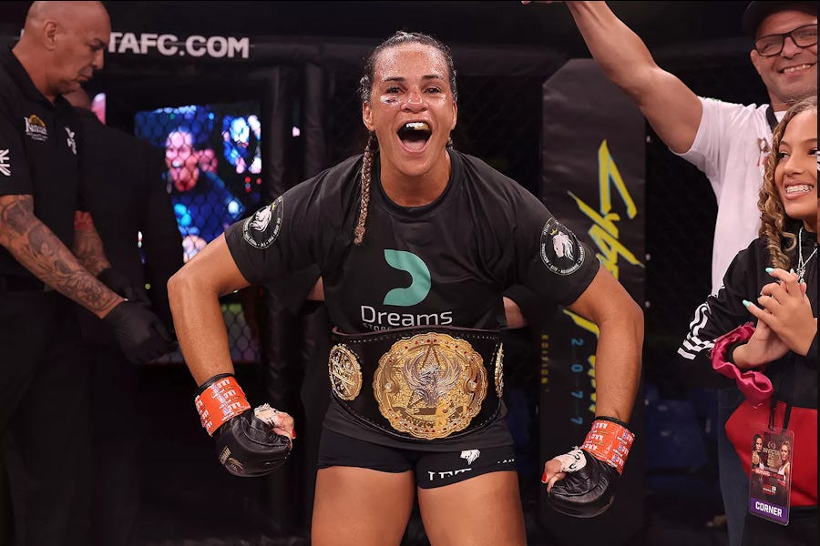 Yup. It's 2024 and Cris Cyborg is still out there. For those who don't know, Cris Cyborg was the canonical women's featherweight fighter, a Muay Thai wrecking machine who didn't just beat but brutalized essentially all of her opponents, including ex-Star Wars Gina Carano, and her popularity as a destroyer of humans is the only real reason women's featherweight even exists as a division, to the point that the UFC added it when she was the only actual fighter at the weight class they employed. She was 20-1 (1) when she passed the torch to Amanda Nunes, who slew her in just fifty-one seconds. She took one more fight in the UFC to complete her contract, but left for Bellator almost immediately afterward with uncharacteristic cooperation from the UFC itself--after all, they'd gotten what they wanted out of her. Her first Bellator fight was a one-sided destruction of their featherweight champion, and she's defended it three times since. At this point in Cyborg's career the problem isn't her or her fighting or her age, but simply that there's no one in Bellator for her to fight--after just five fights she's already hitting rematches, having just recorded her second one-sided bludgeoning of a very game but outmatched Arlene Blencowe. Cyborg decided her next fight would be a boxing match, and on September 25 she faced Simone da Silva, a jobber to the stars coming off twelve straight losses who had been knocked out just one month prior. Undeterred, she had her second boxing match on the undercard of December 10th’s Crawford/Avanesyan card, taking a unanimous decision over Gabrielle “Gabanator” Holloway, who is 6-6 in MMA and 0-3 in boxing. After a year and a half of inactivity, Cris Cyborg returned to MMA to defend her title against Cat Zingano at Bellator 300 on October 7th. It lasted four minutes. It took an entire year of negotiations, but she finally met Larissa Pacheco in a champion vs champion superfight at PFL Super Fights: Battle of the Giants on October 19th, and yet again, Cyborg won.