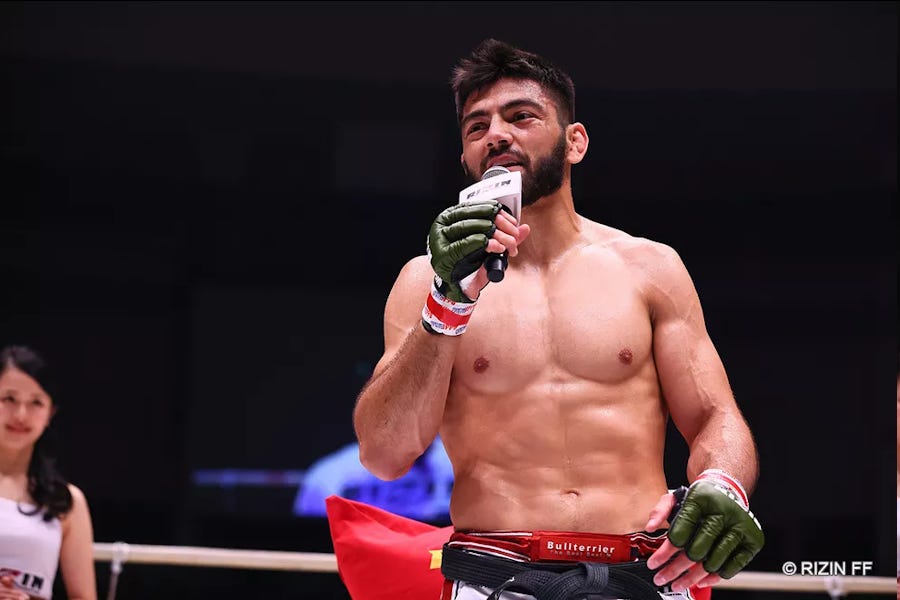 Roberto "Satoshi" de Souza is trying to become the new Gegard Mousasi. On April 17 he had the chance to avenge the only loss of his career, a half-knockout half-injury against "Hollywood" Johnny Case back in 2019, and he succeeded in emphatic fashion, climbing Case's back, locking him in an inverted triangle choke and eventually forcing an armbar. He's now 14-1 and inarguably one of the best lightweights outside of the UFC, but unlike most of the other fighters to bear that title, he has made it clear he has no interest in changing that. Where the A.J. McKees and Michael Chandlers of the world want to test free agency and notoriety, Roberto de Souza is happy in Japan, both because his Rizin pay is fairly lucrative and his entire family jiu-jitsu business is based in the country. This is admirable, but it's also a little unfortunate: Rizin really only has around a dozen lightweights under contract, and "Satoshi" has already beaten a third of them. It was thus of particular interest when the main event for the New Year's Eve Bellator x Rizin card was announced as Roberto de Souza vs AJ McKee--a test of where Souza ranks with the rest of the world's competition. Unfortunately for him and Rizin, the answer was "under them." He positionally threatened McKee and was able to land some solid strikes in the final round, but was otherwise controlled and lost a decision. On May 6th, Satoshi beat Spike Carlyle in a fantastic fight--but it was a non-title fight, because Japanese promoters are still real scared of their own belts. Satoshi fought Patricky Pitbull at Bellator x Rizin 2 on July 29th--in another non-title fight, naturally--and took the first definitive beating of his career, getting utterly outclassed and ultimately stopped on leg kicks in three rounds. He fought Keita Nakamura at Rizin Landmark 9 on March 23 and put in one of the best performances of his career, battering K-Taro to a TKO in just 1:43--but because this is Japanese MMA it was, of course, a non-title fight, so it doesn't count as a title defense. His next title defense--his first in two and a half years--came against Luiz Gustavo at Rizin 48 on September 29, and it saw him drop Gustavo in fifteen seconds and pound him out to a maybe slightly premature TKO.