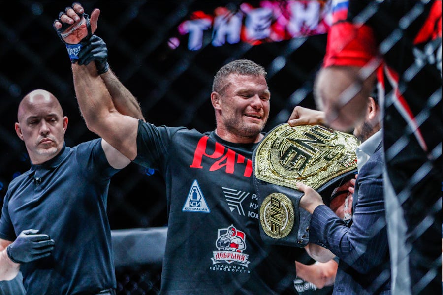 For the second time in as many title reigns, ONE has managed to put a ton of hype behind a champion only to squash them prematurely. Anatoly Malykhin is one of the most successful marketing campaigns ONE ever ran: An undefeated, heavy-punching Russian Heavyweight with a 100% finishing rate. He knocked out everyone he faced, he carried ONE's Heavyweight division as an interim champion while standing champion Arjan Bhullar was having contract issues, and when Bhullar finally re-entered the fold, Malykhin destroyed him with ease. But ONE had greater hopes for Malykhin as their spearhead for real international notoriety: They would make him the first three-division champion in the history of mixed martial arts. And it'd be real easy, because the other two belts were held by one guy. Reinier de Ridder had been their superstar double-champion, but his relationship with ONE had soured, and they cashed in by having de Ridder face Malykhin, twice, at both his weight classes. Malykhin destroyed him and became the first-ever 265, 225 and 205-pound champion the sport has ever seen--admittedly easier when you consider 225 is not a division that exists in almost any other federation on Earth. But he did it! And then they organized his first-ever title defense by having him put the Heavyweight belt on the line against Oumar "Reug Reug" Kane, and he lost a split decision, and now he is a lowly two-belt schmuck. It'll be interesting to see what they do with Malykhin now, given that the last 205-pound fight ONE promoted was Malykhin's bout against de Ridder, and the last 225-pound fight ONE promoted was Malykhin's 2022 bout with de Ridder.