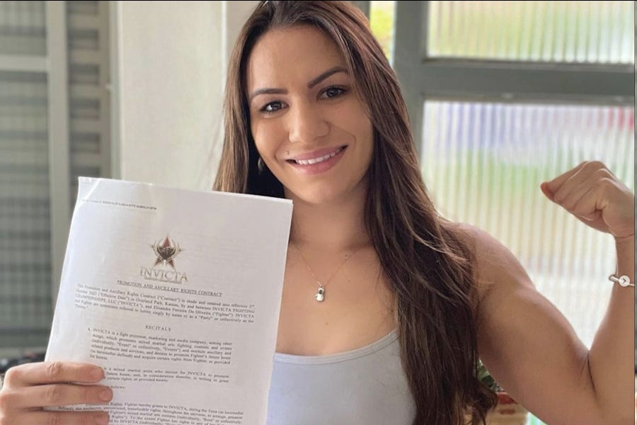 Sometimes you bounce off the top to get where you need to be. Unlike a lot of her peers, Talita Bernardo wasn't a childhood martial artist--she didn't even start training Brazilian Jiu-Jitsu until 2009, when she was already 22, as part of a dare. Five years later she was a brown belt and by the sixth she was 5-1, trained with UFC fighters, and had just won her first international fight after a successful trip to Poland. This put her on the UFC's radar, and in 2017 Germaine de Randamie pulled out of a fight with Marion Reneau, the UFC needed a late replacement, and Bernardo was ready. Except, as it turned out, she wasn't. Over the next year and a half Bernardo went 1-3 in the company, and after getting flattened by Viviane Araujo, she was cut. Talita, undeterred, sat out a couple COVID years before picking up where she left off and just aggressively grappling the shit out of people, and one victory later she was in Invicta, and two victories after that she was its top contender. On January 18, 2023, Talita outworked one-time Contender Series competitor Taneisha Tennant to become the seventh Invicta Bantamweight Champion. After a long wait, half from scheduling problems and half from Invicta itself seeking a new broadcast partner, Bernardo made her first successful defense of the title on June 28, choking out Bellator vet Olga Rubin in two rounds.