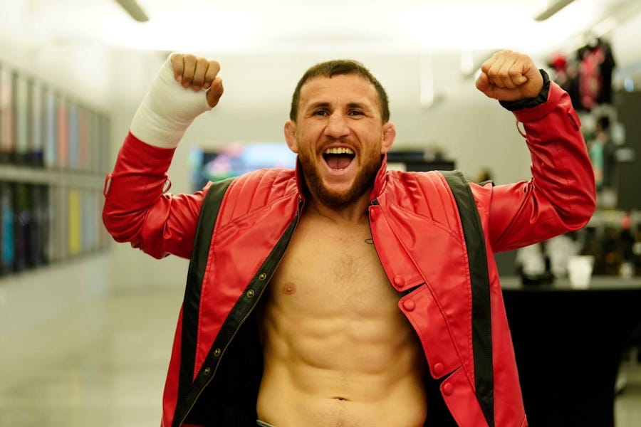 Destiny has come. When Islam Makhachev made his UFC debut in 2015, Khabib Nurmagomedov, considered by most to be the #1 contender and soon to be the best in the world, swore up and down that Makhachev, not him, would be the best lightweight champion of all time. Coming from him, the praise made sense: Khabib and Islam have trained together since they were children growing up and learning to wrestle in Makhachkala. Islam learned under Khabib's father, trained with Khabib's team and even made the pilgrimage to America to join Khabib at the American Kickboxing Academy. And then, two matches into his UFC tenure, Islam got knocked the fuck out in the first round by the little-known Adriano Martins, who hasn't won a fight in the six years since. Even as Makhachev racked up wins, the memory of his loss and his wrestling-heavy approach to his fights let people cast doubts on him. Sure, he's good--but he lost, so he's not as good as Khabib. Islam Makhachev, as his trainer tells it, never wanted to be Khabib. He loves fighting, but he doesn't love the spectacle or the glory or the attention. So when, after ten straight wins, Makhachev was picked to challenge Charles Oliveira for the vacant title he never truly lost, a lot of folks just weren't quite sure what to think. Sure, he was an incredible wrestler, but Charles Oliveira is a submission wizard, and sure, he's on a ten-fight streak, but he hasn't fought a single person actually IN the top ten, and Oliveira represents a huge, dangerous step up as a man who's been destroying some of the most accomplished lightweights in the sport's history. Analyst opinion was split right down the middle; the fight, as it turned out, was nowhere near that competitive, and the only analyst who was entirely correct was Khabib. Islam demolished the former champion, outstriking him, taking him down at will, controlling him in the grappling, and ultimately dropping him with punches and choking him out in the second round. His first defense was a different story. Islam faced featherweight champion Alexander Volkanovski at UFC 284 on February 12th in a rare best-of-the-best, champion vs champion match, and this time, his team's prediction of domination was thoroughly incorrect: It was a pitched battle that ended with Makhachev visibly exhausted and Volkanovski pounding on his face. Islam took an extremely close decision and the divisions will remain separate, but his aura of invulnerability has been thoroughly punctured. Or, at least, it was. In one of those funny moments of sport deterioration, his title defense against Charles Oliveira got scratched thanks to Oliveira busting his eyebrow in training, and on less than two weeks' notice the UFC ran Makhachev/Volkanovski 2, and with no hype, no marketing and no time to prepare, a visibly depleted Volkanovski got dropped by a headkick in the first round. Islam defended his Lightweight title against a Lightweight for the first time against Dustin Poirier at UFC 302 on June 1, and unfortunately for the dreams of many, he dominated Dustin and choked him out in the fifth round.