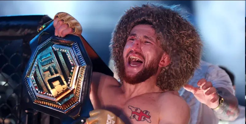 2024 is the year of belated championship justice, and for Merab Dvalishvili, justice has been hard to find. Merab spent his childhood training to wrestle, grapple and fight in his native Georgia, but as a devout fan of mixed martial arts he knew he needed to sacrifice his homeland to secure a future in the sport. More than Georgia, he needed Matt Serra and Ray Longo yelling at him in New York English. Merab's MMA career officially began with a 1-2 record in 2014, and there's an argument to be made that said rookie year is the last time he legitimately lost a fight. By 2017 he was already heralded as an unsigned prospect, and then he made, and lost, his UFC debut--but it was a split decision to Frankie Saenz, and, unsurprisingly, almost all the media scorecards had it in Merab's favor. One fight later he met Ricky Simón, and this time he clearly won a decision--but he had been stuck in a guillotine choke at the end of the fight, and in one of the most batshit endings to a fight I have ever seen, the referee ruled that he was retroactively unconscious after the fight had already ended. Merab had made it to the big show, and Merab was 0-2, and Merab was, to most of the world, already an afterthought. So he started wrestling as hard as he fucking could. Between 2018 and the midpoint of 2024 Merab ran up an astonishing ten-fight winning streak in one of the most talent-rich divisions in the sport. He made himself undeniable as one of the best in the world, and in 2022 he retired one of the greatest in all time, José Aldo, and made himself undeniable as a top contender. There was a problem: He didn't want the contendership. Aljamain Sterling was his good friend, best training partner, and the reigning champion, and Merab had no interest in fighting him, and that made the UFC furious. So when Aljo lost the title in 2023, the UFC denied Merab the shot he had clearly earned and handed it off to Marlon Vera instead. Merab kept winning, and the UFC kept trying to put space between his contendership and promotional favorite Sean O'Malley, but the road ran out on September 14, 2024, when Merab wrestled O'Malley into dust in front of the very tired audience of the Sphere. He's the champion, he has avenged his best friend, and in all likelihood, his next stop is a defense against Umar Nurmagomedov early next year.